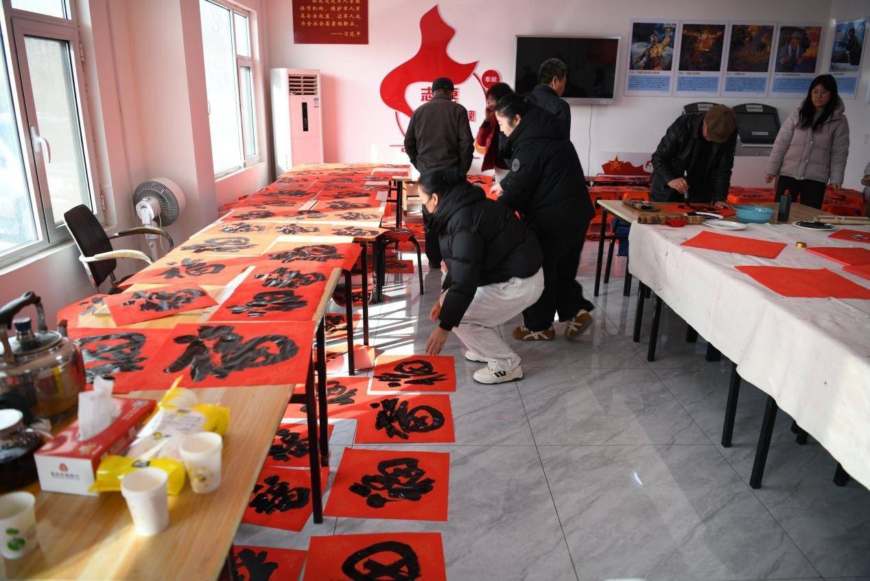 活动现场,几张长桌整齐排开,大红宣纸铺陈就绪。书法爱好者们凝神聚力,笔走龙蛇,或楷书端庄大气,或行书流畅洒脱,或隶书古雅厚重。“一元复始呈兴旺,万象更新启泰祥”“春临大地繁花艳,福到人间喜事多”“马跃前程步步高,春回大地节节兴”等一副副寓意吉祥的春联,搭配着遒劲有力的“福”字,在笔尖下次第绽放。村民们闻讯从四面八方赶来,围在书桌旁驻足观赏,不时发出阵阵赞叹,有的轻声念叨着春联上的佳句,有的主动帮忙抻纸、晾晒,现场一派欢声笑语、喜气洋洋的景象。